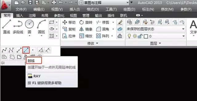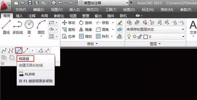 构造线为两端可以无限延伸的直线,没有起点和终点,可以放置在三维空间的任何地方,主要用于绘制辅助线。点击【常用】选项卡【绘图】工具栏中的【构造线】按钮或者执行快捷键【XL】都可以调用构造线命令,如图所示。