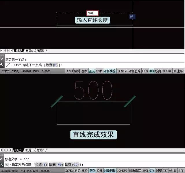 确认直线第一点位置后后拖动鼠标向一侧方向移动,当命令提示行提示【LINE 指定下一点或[放弃(U)]】时,利用键盘输入直线的长度尺寸【以直线长度500mm为例】,输入显示如图所示。输入完成后,连续两次单击【Enter】或者【Space】确认,那么这个长度为【500mm】的直线就绘制完成了。
