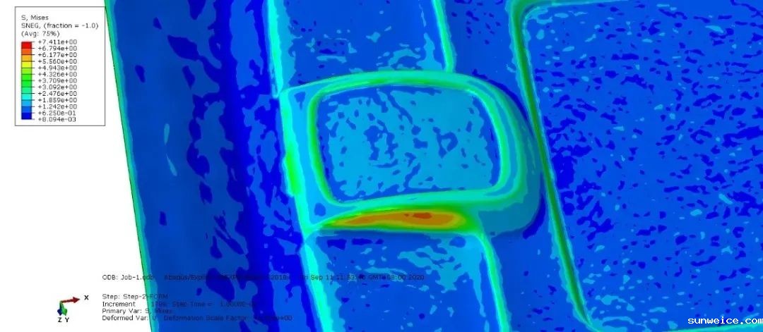 当安全因数为1.5时,此材料的许用应力为5MPa。从图中可知,橙色和红色部分的应力大于5MPa。可以判定,这些区域有失效风险。