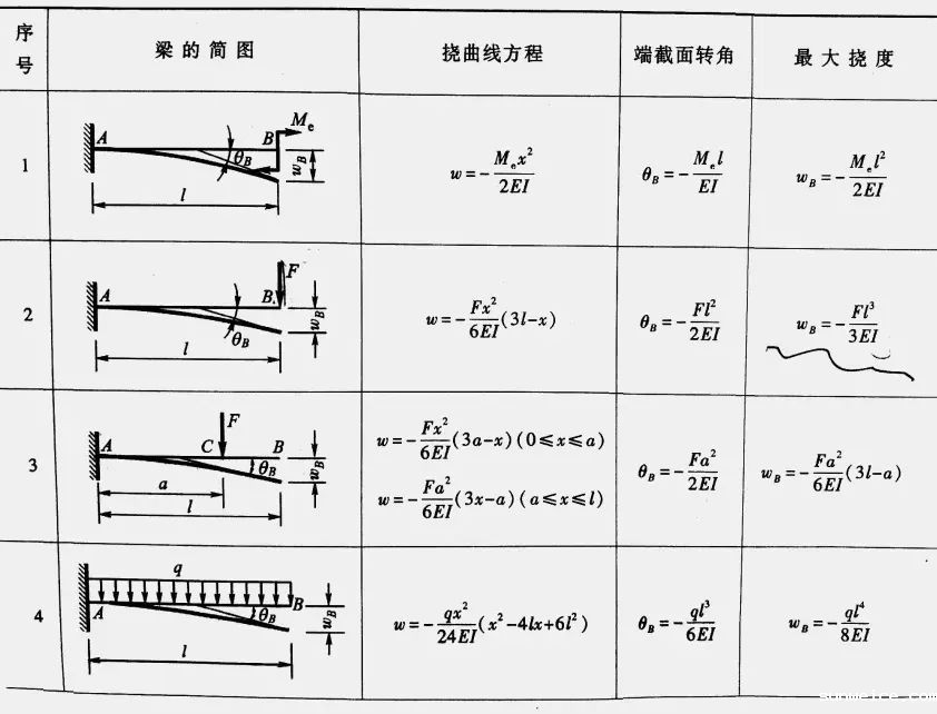 从上式可以得出:若要减小最大挠度,可以减小力F,或减小梁的长度l,或增加材料的弹性模量E,或增加截面惯性矩I