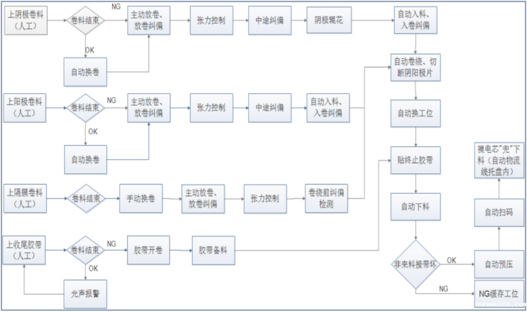 极片由夹辊驱动机构引入卷针部分,与隔膜一同按照工艺要求进行卷绕。卷绕完成后自动换工位、切断隔膜和贴终止胶带,成品裸电芯自动下料后,经过预压、扫码,良品成品裸电芯自动转移到托盘中再转移到后工序。不良品裸电芯自动卸料到不良品裸电芯收集处。